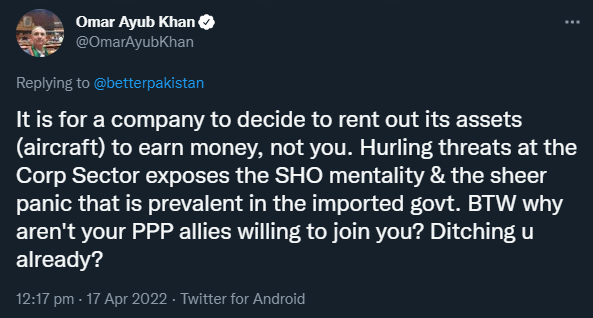 لیگی رہنما کے جواب میں عمر ایوب خان نے جہاں ’حکومت کی ایس ایچ او ذہنیت‘ کا ذکر کیا وہیں یہ سوال بھی کیا کہ ’آپ کی اتحادی پیپلزپارٹی کیوں آپ کا ساتھ نہیں دے رہی۔‘