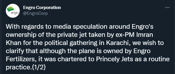 ٹوئٹر پر جاری کردہ وضاحتی پیغام میں اینگرو نے جہاں چارٹر اور نجی خدمات فراہم کرنے والی ایئرلائن پرنسلی جیٹ کے ذریعے طیارہ استعمال ہونے کی تصدیق کی وہاں اس بات کا انکار کیا کہ انہوں نے عمران خان کے سفری اخراجات اٹھائے ہیں۔