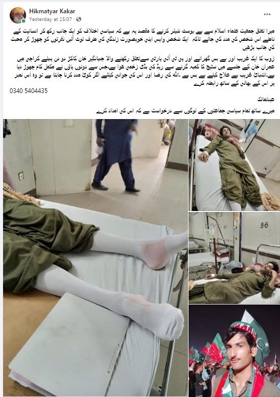 فیس بک پر صارف بخت محمد برشوری نے ’فائٹ فار جے یو آئی‘ نام سے جمعیت علمائے اسلام کے ایک پیج کی جانب سے پی ٹی آئی کے زخمی کارکن کی مدد کے لیے کی گئی پوسٹ پر تبصرہ کیا کہ ’انسانی ہمدردی اور رحم دلی ابھی مری نہیں ہے۔ جی رہے ہیں ابھی کچھ اگلے زمانے والے۔‘