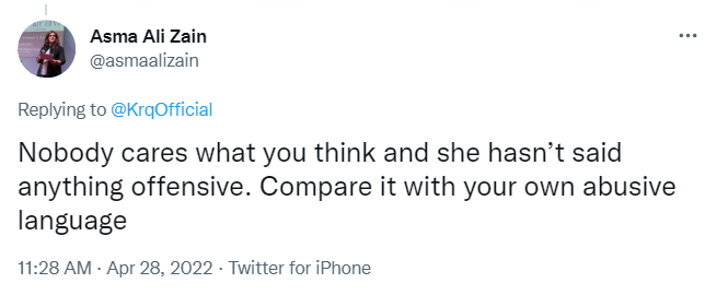 ٹوئٹر صارف اسما علی زین نے لکھا کہ ’آپ کیا سوچتے ہیں کوئی اس کی پروا نہیں کرتا اور انہوں نے کچھ بھی اشتعال انگیز نہیں کہا۔‘