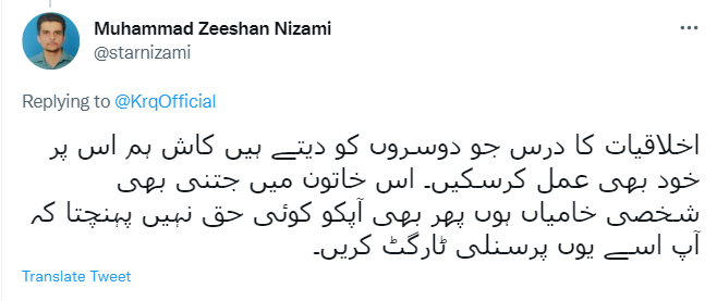 ایک اور صارف محمد ذیشان نظامی نے لکھا کہ ’اخلاقیات کا درس جو دوسروں کو دیتے ہیں کاش ہم اس پر خود بھی عمل کر سکیں۔ اس خاتون میں جتنی بھی شخصی خامیاں ہوں پھر بھی آپ کو کوئی حق نہیں پہنچتا کہ آپ یوں پرسنلی ٹارگٹ کریں۔‘