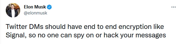 چند روز قبل دیے گئے ایک پیغام میں ایلون مسک نے اس خواہش کا اظہار کیا تھا کہ میسیجنگ ایپ سگنل کی طرح ٹوئٹر کے ڈائریکٹ میسیجز (ڈی ایمز) بھی اینڈ ٹو اینڈ انکرپٹڈ ہونے چاہیں تاکہ کوئی ان کی جاسوسی نہ کر سکے۔
