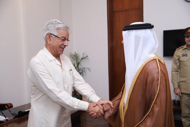 پاکستان کے وزیر دفاع خواجہ آصف سے منگل کو پاکستان میں متحدہ عرب امارات کے سفیر حمد عبید الزعابی نے ملاقات کی ہے۔