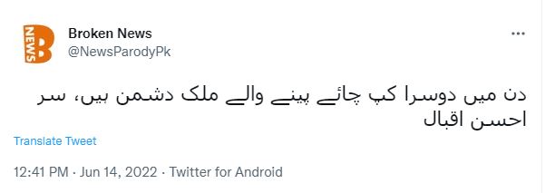 ٹوئٹر پر مشہور پیروڈی اکاؤنٹ ’بروکن نیوز‘ نے احسن اقبال کے بیان پر لکھا ’دن میں دوسرا کپ چائے پینے والے ملک دشمن ہیں، سر احسن اقبال۔‘