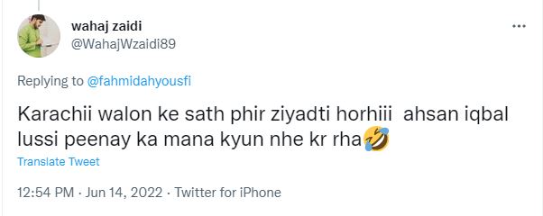 وہاج زیدی نامی صارف نے وفاقی وزیر کے مشورے کو ’کراچی والوں سے زیادتی‘ قرار دیتے ہوئے لکھا ’احسن اقبال لسی پینے کا منع کیوں نہیں کررہے؟‘
