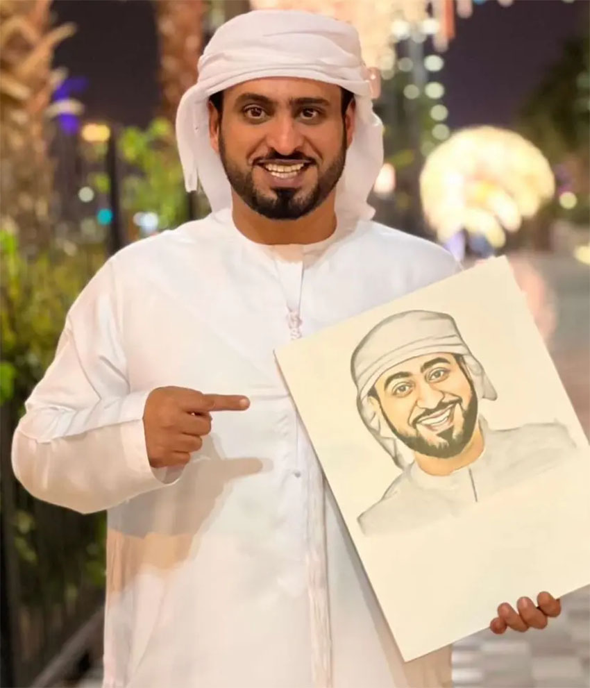 المطیری نے بتایا کہ انہوں نے دبئی کی ایک ریاستی شخصیت شیخ حسن بن وقتہ العرجانی کا پورٹریٹ بنایا جسے مقامی عہدیداروں اور حکمراں خاندان کی شخصیات نے پسند کیا۔