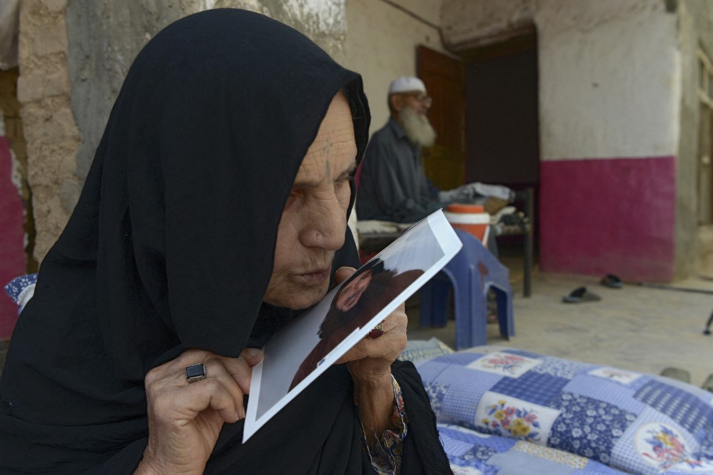 رہا کیے گئے اسداللہ ہارون کی والدہ بیٹے کی تصویر کو چوم رہی ہیں۔ فائل فوٹو: اے ایف پی