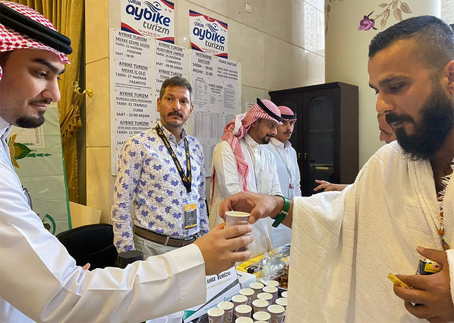 عازمین حج کا خیر مقدم آب زم زم، سعودی قہوے سے:سعودی عرب میں بیرون ملک سے آنے والے عازمین حج کا خیر مقدم آب زمزم، سعودی قہوے، کھجوروں، گلدستوں، مٹھائیوں اور خوراک کے پیکٹوں کے ذریعے کیا جا رہا ہے۔