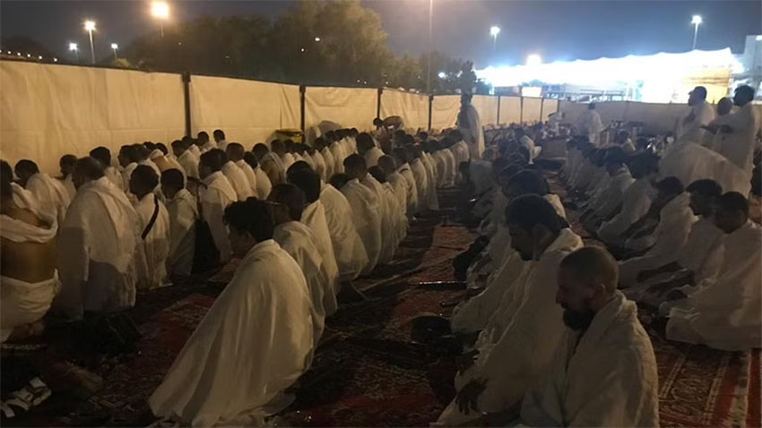 مزدلفہ میں حجاج مغرب اور عشا کی نماز ایک ساتھ ادا کرتے ہیں (فوٹو: سبق)