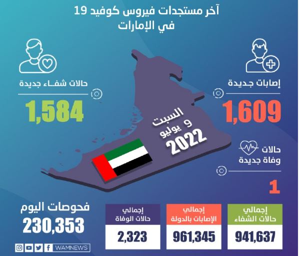 امارات میں عید الاضحی کے پہلے دن کورونا کے 1609 نئے مریض ریکارڈ پر آئے ہیں۔ اس طرح اب تک کل مریضوں کی تعداد 9 لاکھ 61 ہزار 345 ہوچکی ہے۔