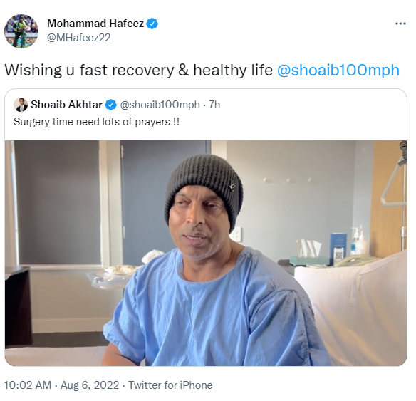 سابق کپتان محمد حفیظ نے ان کے لیے جلد صحت یابی اور صحت مند زندگی کی خواہش کا اظہار کیا ہے۔