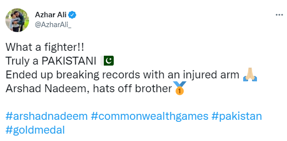 کرکٹر اظہر علی نے لکھا کہ ارشد ندیم نے زخمی بازو کے ساتھ ریکاڑد بنایا۔ ’واٹ اے فائٹر۔۔۔ ٹرولی اے پاکستانی۔‘