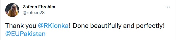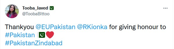طوبی جاوید نے ’پاکستان کو عزت دینے‘ پر اسلام آباد میں یورپی یونین کے سفارت خانے اور سفارت کار دونوں کا شکریہ ادا کیا۔