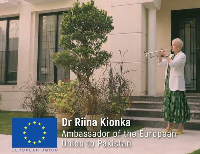 سماجی رابطوں کی ویب سائٹ پر جاری کردہ مختصر ویڈیو میں یورپی یونین کی سفیر برائے پاکستان ڈاکٹر رینا کیونکا کو سبزوسفید لباس زیب تن کیے ہوئے پاکستان کے قومی ترانے کی دھن بجاتے ہوئے دیکھا جا سکتا ہے۔