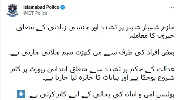 سنیچر کی سہ پہر اسلام آباد پولیس کے ٹوئٹر اکاؤنٹ پر جاری کردہ بیان میں کہا گیا ہے کہ ’عدالت کے حکم پر تشدد سے متعلق ابتدائی رپورٹ پر کام شروع ہو چکا ہے اور بیانات کا جائزہ لیا جا رہا ہے۔‘