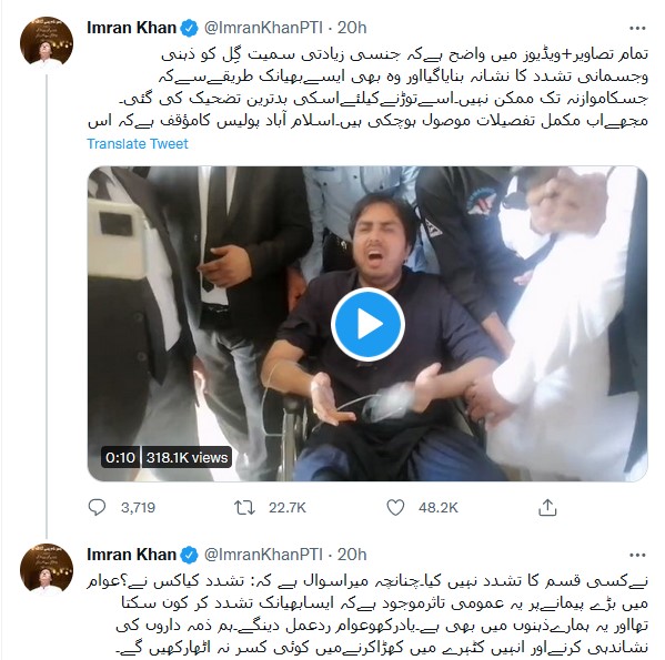 جمعہ کو سابق وزیراعظم عمران خان نے اپنی ٹویٹس میں دعوی کیا تھا کہ ’شہباز گل کو ذہنی و جسمانی تشدد کے ساتھ جنسی زیادتی کا نشانہ‘ بنایا گیا ہے۔
