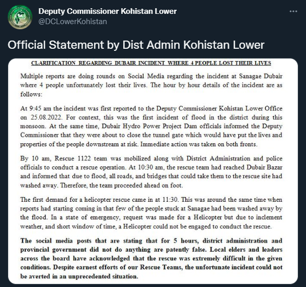کوہستان واقعے پر تبصرہ کرتے ہوئے ضلع لوئر کوہستان کی انتظامیہ نے اسے ’افسوسناک‘ قرار دیتے ہوئے معاملے کی تصدیق کی البتہ ساتھ ہی یہ وضاحت بھی کی کہ ’سناگئی دبیر میں چار افراد کی ہلاکت کا واقعہ ایسے وقت میں پیش آیا جب دبیر ہائیڈرو پاور پروجیکٹ ڈیم کے حکام نے ٹنل گیٹ بند کرنے کی اطلاع دی۔‘