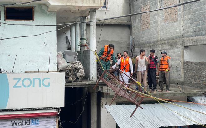 امدادی کارکن فرمان اللہ نے میت کو اٹھانے والی آہنی چارپائی کے ذریعے خطرے سے دوچار ایک خاندان کے پانچ افراد کو نکالا۔