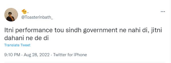 ایک صارف نے طنزاً لکھا کہ ’اتنی پرفارمنس تو سندھ گورنمنٹ نہیں دی جتنی دھانی نے دے دی۔‘ واضح رہے دھانی کا تعلق پاکستان کے صوبہ سندھ کے علاقے لاڑکانہ سے ہے۔