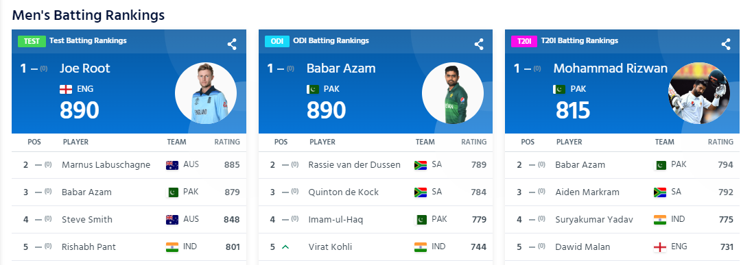 بدھ کو اپ ڈیٹ کی گئی رینکنگ کے مطابق ٹیسٹ کرکٹ میں انگلینڈ کے جوروٹ سرفہرست اور ون ڈے رینکنگ میں پاکستانی کپتان بابراعظم اب بھی ٹاپ پوزیشن پر موجود ہیں۔