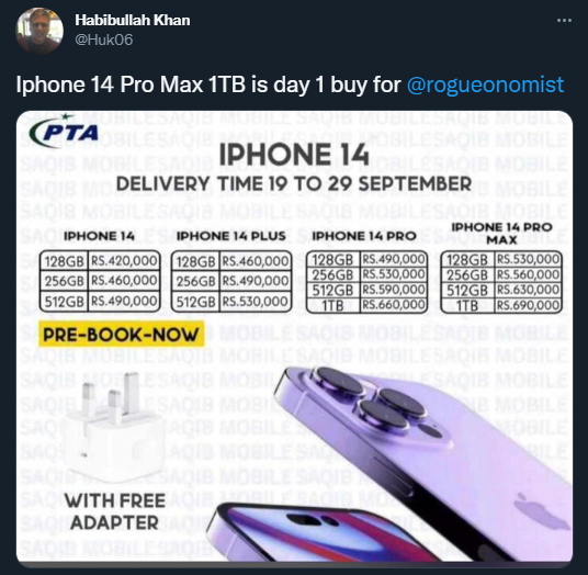 شاہد حسین نے ایپل اور ایپل سپورٹ کو مینشن کرتے ہوئے توجہ دلائی کہ یہ پاگل پن جیسی قیمتیں ہیں کیونکہ پاکستان میں ایپل کی مصنوعات خریدنے کے لیے کوئی قابل اعتبار طریقہ نہیں ہے۔