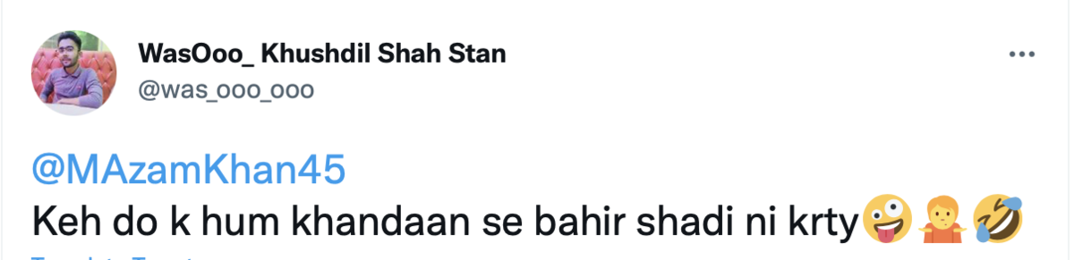 اعظم خان کو ویسٹ انڈین لڑکی کی جانب سے شادی کی آفر آنے پر ٹوئٹر صارفین کے جانب سے بھی دلچسپ تبصرے دیکھنے میں آرہے ہیں۔