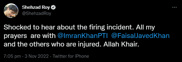 جمعرات کی سہ پہر پی ٹی آئی لانگ مارچ کے مرکزی کنٹینر پر فائرنگ اور بعد میں عمران خان سمیت متعدد افراد کے زخمی ہونے کی خبر سامنے آئی تو سوشل ٹائم لائنز پر واقعے کی بھرپور مذمت کی گئی۔