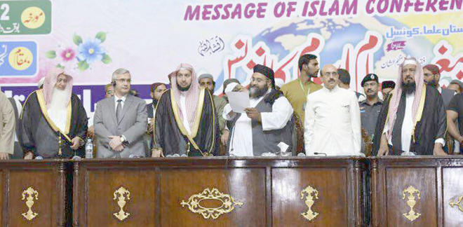 امت مسلمہ کو درپیش چیلنجوں سے نمٹنے کی خاطر اپنی صفوں میں اتحاد پیداکرنا ہوگا۔ ہم بین المذاہب ہم آہنگی کے داعی ہیں۔ اسلام ہمیںفلاح انسانیت اور امن کا درس دیتا ہے۔ مغرب جانتا ہے کہ اسلام میانہ روی اور اعتدال کا دین ہے مگر صرف اپنے مفاد کی خاطر بدنام کرتا رہتا ہے ، ہمیں خود پیغام اسلام کانفرنسوں کے ذریعہ سے اسلام کا اصل پیغام سامنے لانا ہوگا تاکہ سازشوں کو ناکام بنایا جا سکے ۔ سعودی حکومت کے نمائندہ ڈاکٹر ا لشیخ طلال العقیل نے کہا کہ سعودی عرب اور پاکستان ایک ہی ملک ہے ، ہمارا دشمن بھی ایک ہے ، جو حرمین شریفین مکہ و مدینہ سے نفرت کرتا ہے ،دونوں ممالک کے عوام ایک دوسرے ملک سے محبت کرتے ہیں،انہیں کوئی جدا نہیں کر سکتا ۔انہوں نے کہا کہ دونوں ملکوں کے تعلقات کے استحکام اور حرمین شریفین کے تحفظ کی خاطر حافظ طاہر اشرفی کی خدمات کا اعتراف سعودی عوام اور میڈیا میں کیا جاتا ہے ۔ سعودی وزیر مذہبی امور کے مشیر خاص ڈاکٹرراشد الزہرانی نے اپنے خطاب میں کہا کہ سعودی عرب اور پاکستان کے تعلقات مین کوئی خرابی پیدا نہیں کرسکتا۔دونوں ملکوں کا امن و استحکام ایک دوسرے سے جڑا ہے ،پاکستانی قوم اور فوج نے دہشتگردی اور انتہا پسندی کو شکست دی ۔
