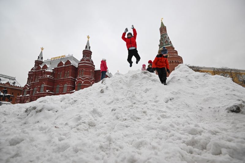 ماسکو میں ریڈ سکوائر کے قریب بچے برف میں کھیل رہے ہیں۔