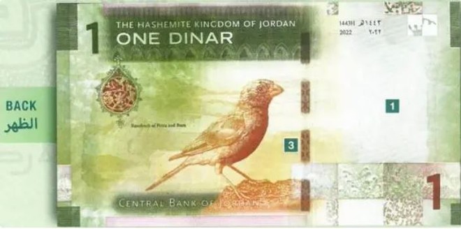 ایک دینار والے کرنسی نوٹ میں پرندے کی تصویر ہے جو نیا اضافہ ہے۔ اردن میں یہ پرندہ العصفور الوردی السینائی کے نام سے معروف ہے اور یہ اردن کا قومی پرندہ ہے۔