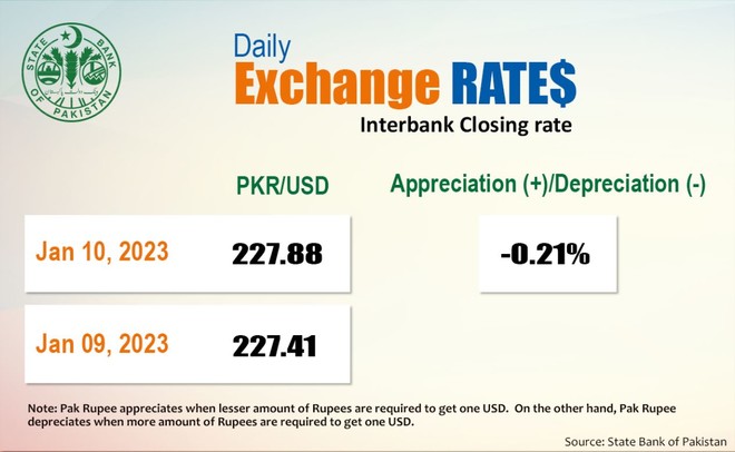 سٹیٹ بینک کی جانب سے منگل کو جاری کردہ کرنسی ایکسچینج رپورٹ کے مطابق پاکستانی روپے کے مقابلے میں امریکی ڈالر کی قیمت 47 پیسے کے اضافے کے بعد 227.88 روپے ہوگئی ہے۔