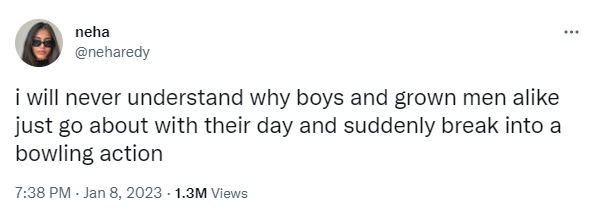 نیہا نامی ایک صارف کی جانب سے ٹویٹ کی گئی کہ ’مجھے کبھی سمجھ نہیں آئے گی کہ لڑکے حتٰی کہ بڑی عمر کے مرد بھی دن کو اپنا کام کرتے کرتے اچانک بولنگ ایکشن میں کیوں آ جاتے ہیں؟‘