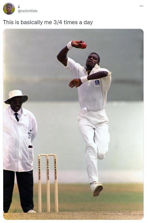 نو لِمٹ لیب نامی ایک ہینڈل نے سابق ویسٹ انڈین فاسٹ بولر کرٹلی ایمبروز کی تصویر لگاتے ہوئے کہا کہ ’میں دن میں تین چار مرتبہ ایسا کرتا ہوں۔‘