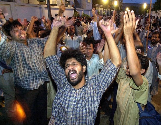 آٹھ اگست 2001 کو نعمت اللہ خان کے میئر منتخب ہونے پر کراچی میں جماعت اسلامی کے کارکنوں کا جشن۔ (فوٹو: اے ایف پی)
