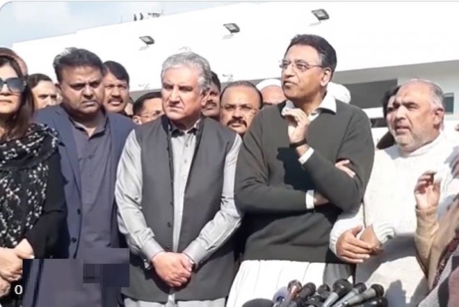 بعدازاں تحریک انصاف کے رہنماؤں اسد قیصر، شاہ محمود قریشی، اسد قریشی اور فواد چوہدری نے پارلیمنٹ ہاؤس کے باہر میڈیا سے گفتگو کرتے ہوئے کہا کہ ’سپیکر کا یہ اقدام غیرقانونی ہے۔ یہ جمہوریت کے نام پر مذاق ہے۔‘