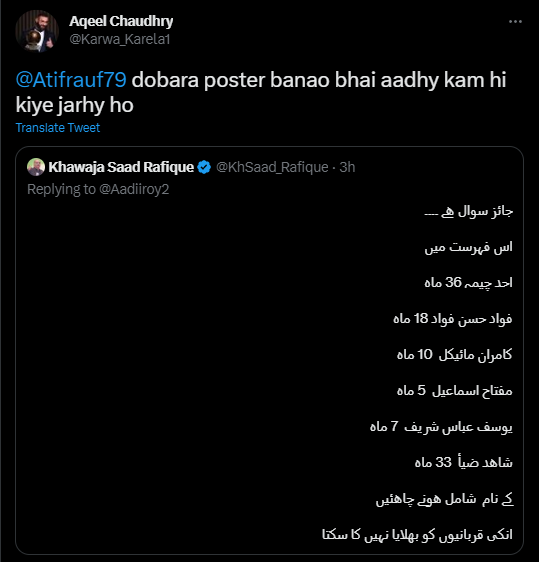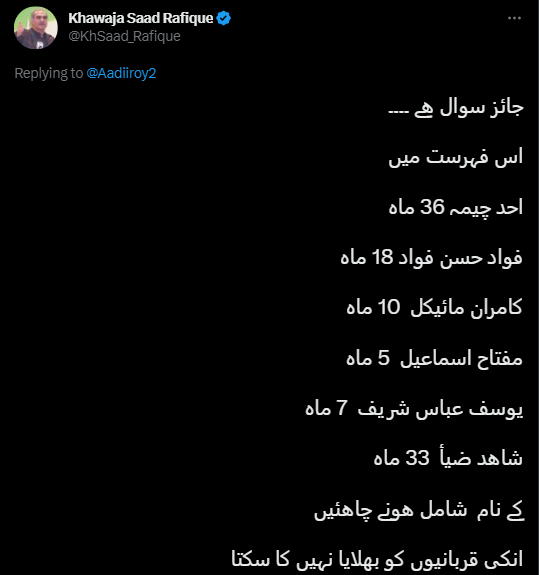 جوابی ٹویٹ میں انہوں نے اپنا موقف بیان کیا تو اشتہار میں بچ رہ جانے والے رہنماؤں کے نام اور ان کی گرفتاری کے عرصہ کی نشاندہی بھی کی۔