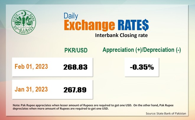 سٹیٹ بینک کے کی جانب سے جاری کردہ کرنسی ایکسچینج ریٹ کے مطابق کاروباری ہفتے کے تیسرے روز ڈالر کی قدر 268.83 روپے رہی۔