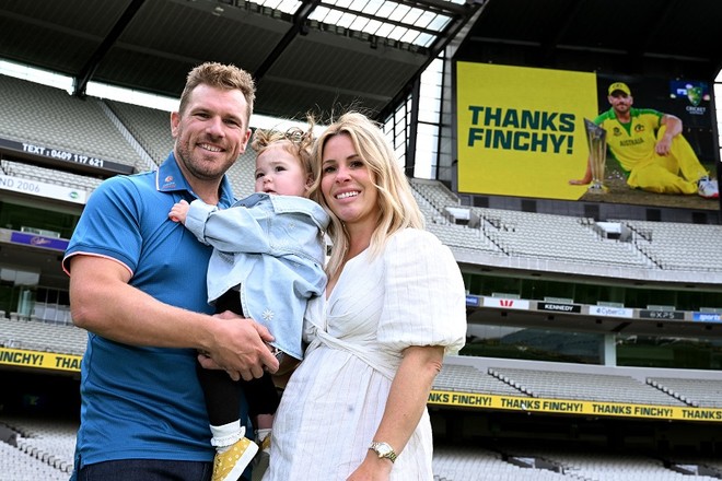 ایرون فنچ بین الاقوامی کرکٹ سے اپنی ریٹائرمنٹ کے اعلان کے بعد اپنی بیوی ایمی اور بیٹی کے ساتھ۔ (فوٹو: اے ایف پی)