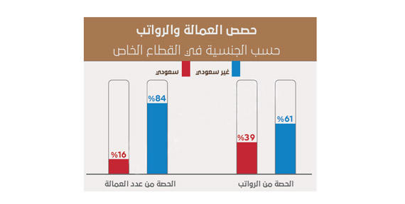 ریاض.... نجی اداروں و کمپنیوں میں ملازمین کی سالانہ مجموعی تنخواہ 305.9ارب ریال ریکارڈ کی گئی ہے۔ اسکا 61فیصد (187.8ارب ریال ) غی ملکی ملازمین وصول کررہے ہیں۔ نجی کمپنیاں و ادارے اپنے سعودی ملازمین کو سالانہ 118.1ارب ریال یعنی مجموعی تنخواہ کا 39فیصد پیش کررہے ہیں۔نجی اداروں میں سعودیوں کا تناسب 16فیصد ہے جبکہ تنخواہوں میں انکا تناسب 39فیصد ہے۔نجی اداروں میں غیر ملکیوں کا تناسب 84فیصد ہے جبکہ تنخواہوں میں انکا حصہ صرف 61فیصد ہے۔ 2016ءکی آخری سہ ماہی کے اعدادوشمار کے مطابق نجی اداروں میں کارکنان کی مجموعی تعداد 10.26ملین تھی۔ ان میں 8.59ملین غیر ملکی اور 1.68ملین سعودی شہری تھے۔