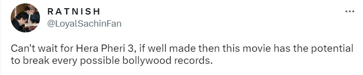 ابھیشیک اپنی ٹویٹ میں کہتے ہیں کہ ’ہیرا پھیری 3 اپنی اوریجنل کاسٹ کے ساتھ بننے والی ہے۔ یہ دنیا ٹھیک ہو رہی ہے۔‘