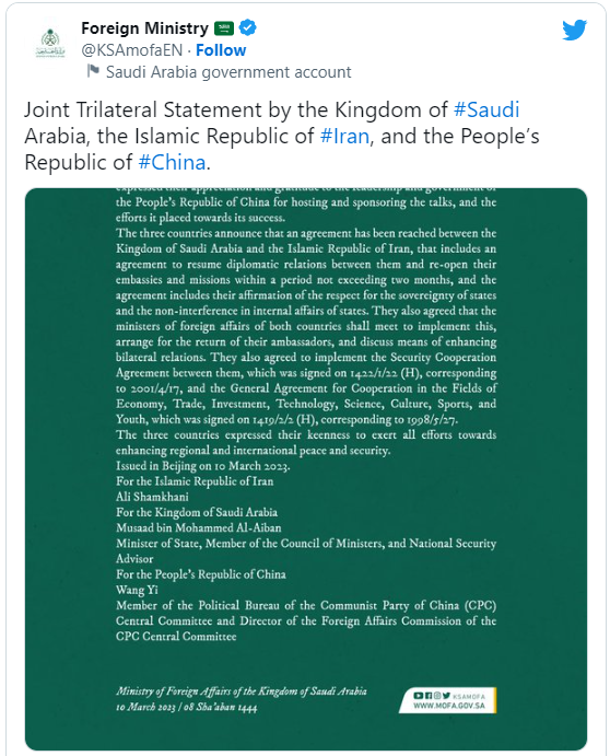 ’تینوں ممالک نے اعلان کیا ہے کہ سعودی عرب اور اسلامی جمہوریہ ایران کے درمیان ایک معاہدہ ہو گیا ہے۔‘