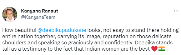کنگنا رناوت نے لکھا کہ ’دیپکا کتنی پیاری لگ رہی ہیں، انہوں نے جس انداز میں اپنی پوری قوم کے امیج اور عزت کو اپنے کندھوں پر اٹھا کر جس دلکش اور پراعتماد انداز میں دنیا کے سامنے پیش کیا وہ آسان کام نہیں۔ دیپکا انڈین خواتین کے بارے میں اس حقیقت کا جیتا جاگتا ثبوت ہیں کہ انڈین خواتین بہترین ہیں۔‘