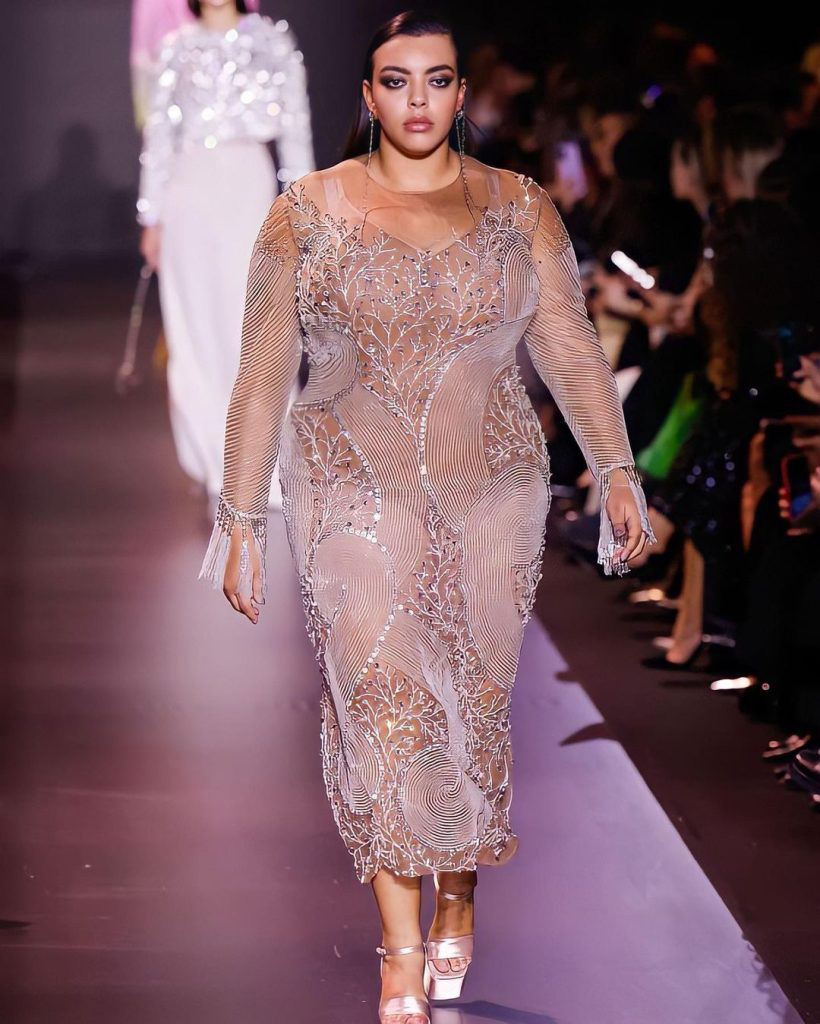 لبنانی ڈیزائنر کے اس شو میں دبئی کے برانڈ کے لیے امریکی پلس سائز ماڈل گراہم خصوصی طور پر شریک تھیں۔