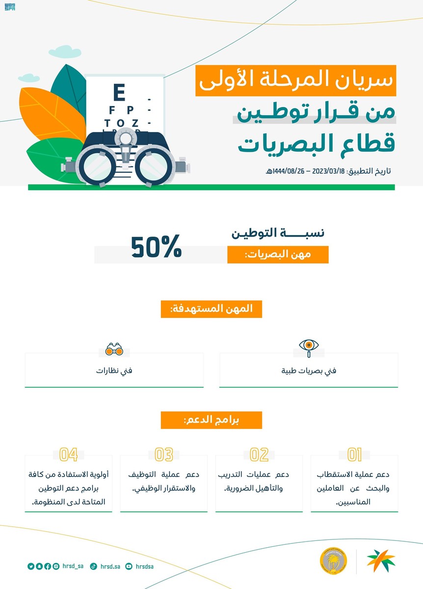 سعودی خبررساں ایجنسی ایس پی اے کے مطابق وزارت افرادی قوت وسماجی بہبود آبادی کی جانب سے مملکت میں مختلف نجی شعبوں میں سعودائزیشن کے پروگرام پرتیزی سے عمل جاری ہے۔ وزارت نے چشموں کی دکانوں میں 50 فیصد سعودی شہریوں کومتعین کرنے کے احکامات دیے تھے۔