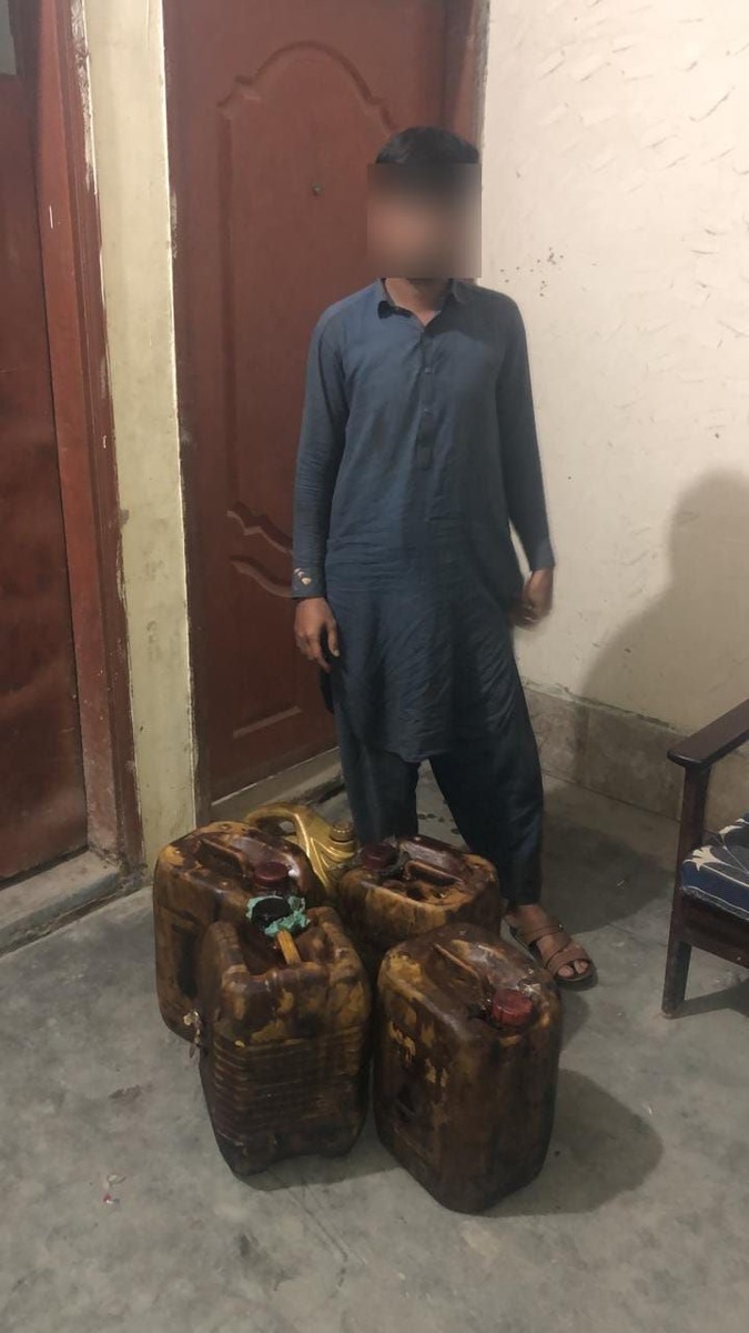 پولیس کے مطابق ملزم کے قبضے سے 80 لیٹر کے قریب چوری شدہ خام تیل ملا ہے۔ (فوٹو: کراچی پولیس)