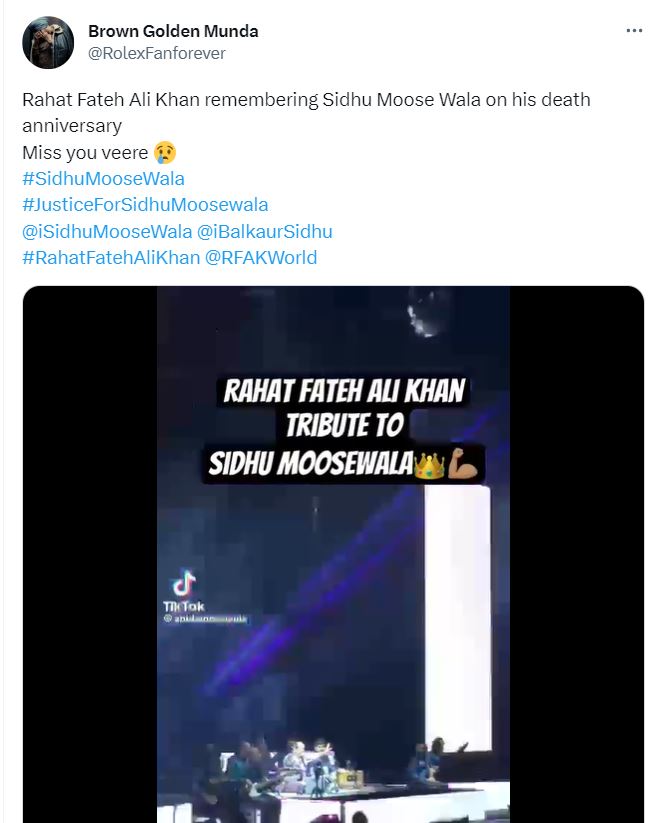 رولیکس فین فارایور ہینڈل نے ایک ویڈیو شیئر کرتے ہوئے لکھا کہ ’راحت فتح علی خان سدھو موسے والا کو خراج تحسین پیش کر رہے ہیں۔‘