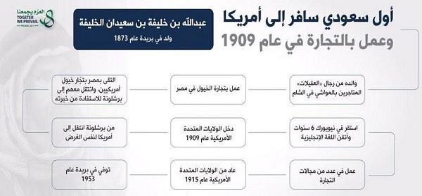 ریاض:پہلا سعودی شہری108سال پہلے امریکہ پہنچا تھا۔ وزارت خارجہ کے ریکارڈ کے مطابق 1909ءمیں سعودی شہری عبد اللہ بن خلیفہ بن سعیدان الخلیفہ پہلا سعودی شہری تھا جو امریکہ گیا تھا۔ وہ امریکہ میں 6سال رہا ۔ الخلیفہ1873ءمیں بریدہ میں پیدا ہوا اور اپنے والد کی تجارت سنبھال لی۔ بعد ازاں اس نے گھوڑوں کی خرید وفروخت شروع کی۔ مصر میں گھوڑوں کی خرید وفروخت کرنے گیا اور وہاں اسی پیشے سے منسلک امریکی شہریوں سے دوستی ہوگئی۔ وہ ان کے ساتھ بارسلونا منتقل ہوا اور وہاں سے امریکہ گیا۔ نیویارک میں 6سال گزارے اور اس کے بعد سعودی عرب واپس آگیا۔ اس وقت چند سعودی شہریوں میں تھا جنہیں انگریزی آتی تھی۔ اس کی فات بریدہ میں 1953ءمیں ہوئی۔
