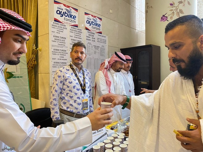عازمین حج کی خدمت پرمامور کمپنی ’الطوافہ‘ کی جانب سے مکہ مکرمہ آنے والے عازمین کا استقبال آب زمزم، سعودی قہوے اور کھجوروں سے کیا جارہا ہے۔