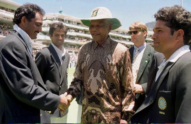 1997 میں جنوبی افریقہ کے دورے پر آئی انڈین ٹیم کے محمد اظہر الدین اور سچن تندولکر نیلسن منڈیلا سے مل رہے ہیں۔ (فوٹو: اے پی)