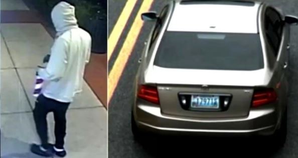 اس شخص نے سفید رنگ کی جیکٹ یا ہوڈی پہن رکھی ہے اور گاڑی پر میری لینڈ کی لائسنس پلیٹ بھی نظر آ رہی ہے۔